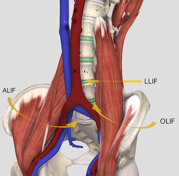 En el lado izquierdo de la columna lumbosacra existe un claro corredor anatómico, de aproximadamente 18 mm, entre la aorta y el psoas que se extiende desde L2 hasta L5. Este espacio puede ser utilizado para abordar el disco intervertebral y realizar una fusión intersomática con la posibilidad de dejar los grandes vasos en su situación nativa.