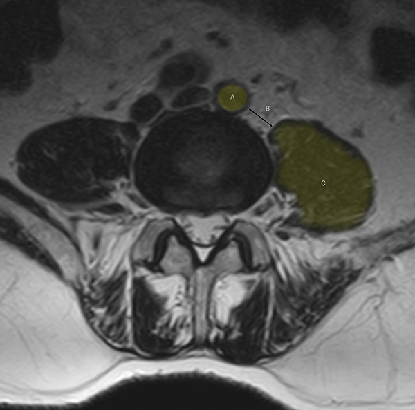 Figura 2: Reconocimiento en imágenes (RMN) del espacio de trabajo en la técnica OLIF a niel L4-L5. A: Arteria Ilíaca izquierda, B: corredor OLIF. C: músculo psoas. Se sugiere un espacio entre A y C mayor a 1 cm.