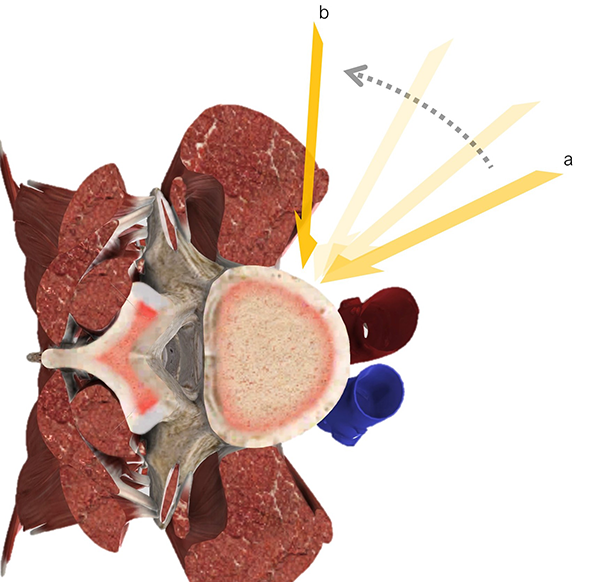 El acceso oblicuo, sin embargo, presenta algunas limitaciones y desventajas. El corredor anatómico se encuentra únicamente en el lado izquierdo del paciente. Hacia la derecha, la localización de la vena cava imposibilita su uso, limitando las indicaciones de esta técnica ante determinadas deformidades espinales. La maniobra ortogonal es técnicamente demandante y particularmente dificultosa ante cuadros de rotación axial, como ocurre en la escoliosis. Esto puede asociarse con lesiones neurológicas sea por la violación central del conducto raquídeo o el foramen contralateral.