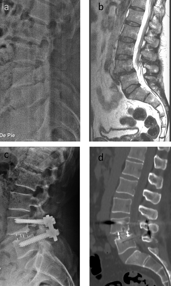 Figura 8: Imágenes pre (a y b) y postoperatorias (c y d) del paciente número 3. El mismo presentaba radiculopatía bilateral y claudicación neurógena de la marcha, asociado a dolor lumbar mecánico refractario al tratamiento conservador. Se realizó un OLIF L4-5 y una instrumentación posterior segmentaria por vía Wiltse.