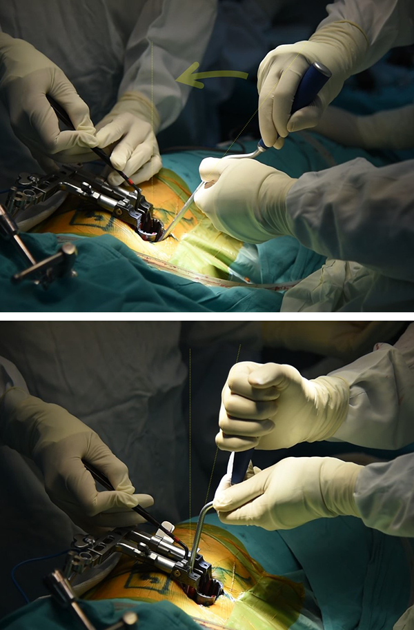 Figura 7: Fotografía intraoperatoria demostrando el cambio en la dirección del instrumental durante la maniobra ortogonal. Arriba, dirección oblicua. Abajo, dirección ortogonal.