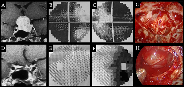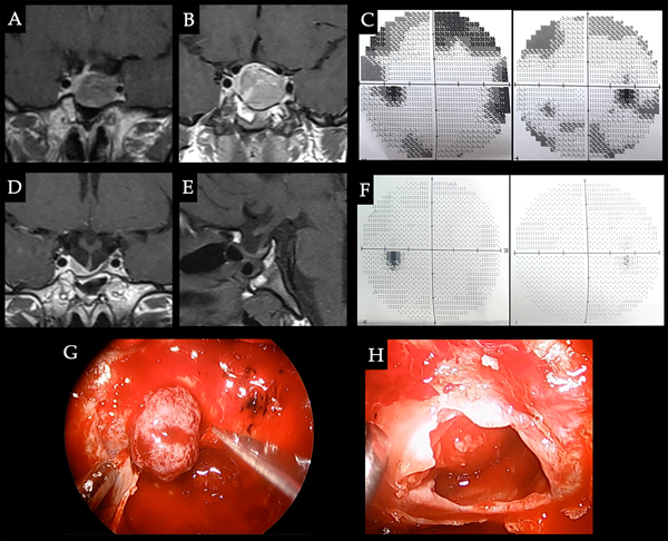 Caso 5. Alteraciones visuales. Paciente femenina de 47 años que consultó por alteración del campo visual y cefalea. PRL: 47 ng/ml. Se decidió resección quirúrgica. Se logró resección completa con normoprolactinemia postoperatoria y mejoría del CVC. A. RM preoperatoria donde se observa adenoma selar-supraselar con compromiso de la vía óptica. B-C. CVC con hemianopsia bitemporal con extensión nasal. D. RM pop con resección completa. E-F. CVC pop con mejoría. G. Imagen intraoperatoria donde se reconocen reparos anatómicos selares y el adenoma luego de la apertura dural. H. Cavidad sin lesión residual, descenso de la cisterna supraselar y remanente glandular a derecha.