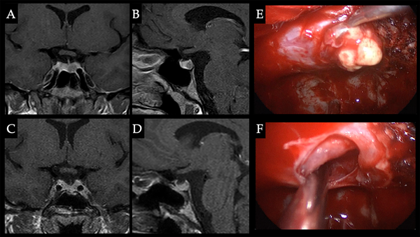 Caso 2. Intolerancia a los AD. Paciente de 28 años con cuadro de amenorrea + galactorrea y cefalea. Hiperprolactinemia de 140 ng/ml. Realizó tratamiento con cabergolina y bromocriptina presentando intolerancia a ambos fármacos por lo cual se decidió conducta quirúrgica obteniéndose la remisión. A-B. RM preoperatoria que evidencia microadenoma izquierdo. C-D. RM postoperatoria sin tumor residual. E. Resección tumoral en hemiglándula izquierda. F. Cavidad libre de tumor.