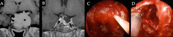 Caso 3. Fístula de LCR. Paciente masculino de 25 años, consulta por cefalea y ptosis palpebral izquierda. Se detecta PRL de 4700 ng/ml e inicia tratamiento con cabergolina, a las 2 semanas de tratamiento presenta cuadro de fístula de LCR por lo cual se decide conducta quirúrgica, lográndose resección parcial, el resto del volumen tumoral fue controlado con AD. A. RM que evidencia voluminosa lesión selar con invasión del seno cavernoso izquierdo. B. RM post tratamiento con cirugía + AD, que evidencia pequeño residuo tumoral en seno cavernoso izquierdo. C. Exposición selar y del seno cavernoso izquierdo, corroboración de posicionamiento carotídeo con doppler transnasal. D. Cavidad luego de la resección tumoral, remanente de consistencia firme en seno cavernoso izquierdo.