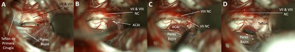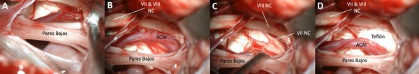 Colocación del teflón: una vez identificado el conflicto neurovascular, se coloca el teflón entre la arteria y el nervio, intentando que el mismo quede "enganchado" en el lugar con bridas aracnoideas, para evitar su movimiento posterior. En el caso de que el teflón no quede bien sujetado, se coloca cola de fibrina para sujetarlo. Es importante intentar colocar el teflón entre la arteria y el tronco cerebral y no directamente sobre el nervio; algunas veces no hay otra alternativa que colocarlo sobre el nervio (Figura 3).
