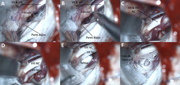 Figura 1. Al ingresar a la cisterna del ángulo pontocerebeloso se observa el flóculo obstruyendo la visión del sitio de salida real del nervio facial (A y B). La disección aracnoidea del floculo desde la cisterna de los pares bajos permite la retracción desde caudal a rostral que limita el estiramiento latero-medial (C y D). Se identifica la arteria cerebelosa anteroinferior; se la reclina y separa del nervio, interponiendo una lámina de teflón (E y F).