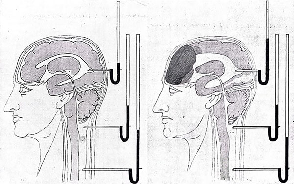 Iniciando el siglo XX Theodor Kocher señaló tal vez de un modo exagerado, que la presión lumbar no brinda ninguna información cierta de la presión dentro del cráneo, ya que puede caer muy rápidamente en la columna mientras permanece elevada en el cráneo.16 Si bien la presión del LCR fue frecuentemente medida a nivel espinal, la presunción de diferencias de presión a través del tentorio y del foramen magno se basó mayormente en el hallazgo de desplazamientos y distorsiones tisulares para configurar los que luego se denominaron "conos" de presión.8, 23, 35 La constatación de tales diferencias de presión a nivel espinal (mediante la maniobra de Queckenstedt y sus variantes), o entre las cavidades ventriculares y la cisterna lumbar (ventrículo-lumbares) vino a corroborar aquella idea.23 En condiciones normales la comunicación ventrículo-subaracnoidea es completa y las presiones medidas en decúbito lateral son iguales.13 Sin embargo, debido a la casi imposibilidad en aquellos años de lograr diagnósticos tempranos, al momento de estudiar a los pacientes la comunicación de los espacios de LCR se encontraba interrumpida hasta en el 5% de las lesiones supratentoriales y hasta en 2/3 de las infratentoriales, siendo en tales casos la presión lumbar siempre inferior. Posteriormente resultaría claro que tales diferencias desembocarían en evoluciones desfavorables.26