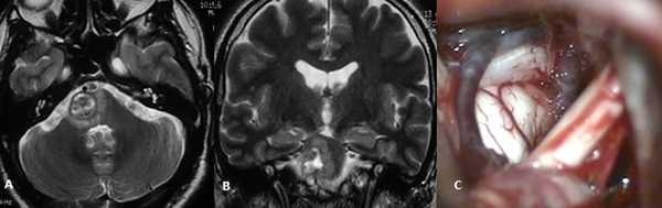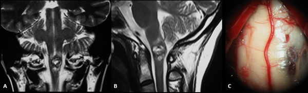 Figura 2: RM ponderación en T2, proyección axial (A) y coronal (B) donde se evidencia cavernoma Zabramski II localizado a nivel del puente, lateralizado hacia la derecha. Imagen intraoperatoria de mismo paciente (C) con evidencia de lesión en contacto con superficie pial del tronco cerebral; abordaje retrosigmoideo.