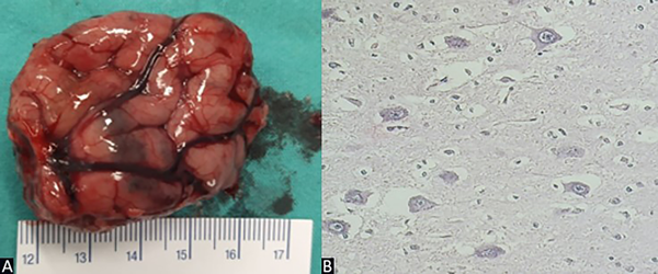 Figura 5. Caso 1. A) Exéresis de lesión de 4.5 cm de largo. B) Preparado de anatomía patológica: alteración de la laminación cortical, neuronas dismórficas y gigantes, células en balón, núcleos grandes y múltiples.