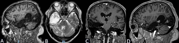 Figura 6. Caso 1: RM de cerebro postquirúrgica. A) Secuencia T1, corte sagital. B) Secuencia T2, corte axial. C) Secuencia T1 con contraste, corte axial. D) Secuencia T1 con contraste, corte coronal.