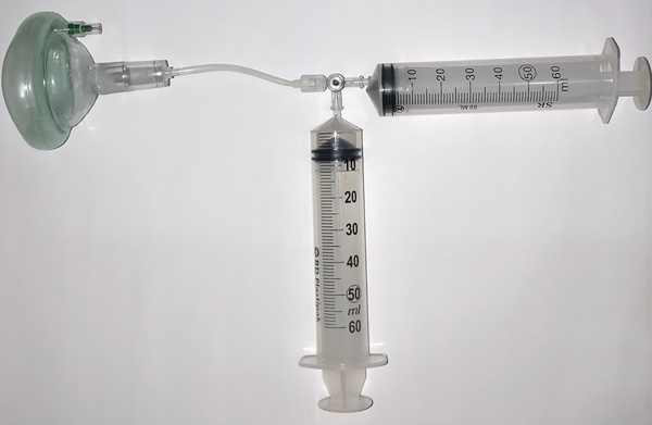 El SiRAMa está compuesto por: (1) una máscara facial de anestesia pediátrica, (2) una porción de una guía de suero, (3) una llave de 3 vías, y (4) dos jeringas de 60 ml (Fig. 1). La máscara de anestesia pediátrica debe ser maleable para ajustarse al cráneo del paciente y además ser transparente para visualizar el mismo durante el procedimiento. El montaje del dispositivo requiere conectar el orificio de ventilación de la máscara de anestesia pediátrica a la porción de la guía de suero, éste a la llave de 3 vías y ésta a las dos jeringas (Fig. 2).