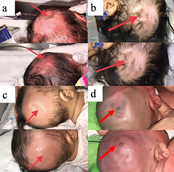 Caso 4: paciente varón de 1 día de vida de un embarazo controlado que nació por cesárea, con peso y perímetro cefálico acorde a la edad. Presentó una fractura deprimida en “ping pong” congénita. Se realizó una radiografía de cráneo la cual evidenció la mencionada fractura deprimida en “ping pong” a nivel parietal derecho de 1,6 cm de depresión. Se realizó una ecografía transfontanelar la cual no evidenció alteraciones asociadas. El paciente no presentaba signos ni síntomas neurológicos.