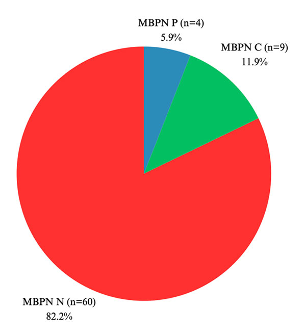 Figura 1. Distribución de las categorías correspondientes a los grupos de estudio. MBPN C: Meningitis bacteriana postneuroquirúrgica confirmada. MBPN P: Meningitis bacteriana postneuroquirúrgica presuntiva. MBPN N: Meningitis bacteriana postneuroquirúrgica negativa.