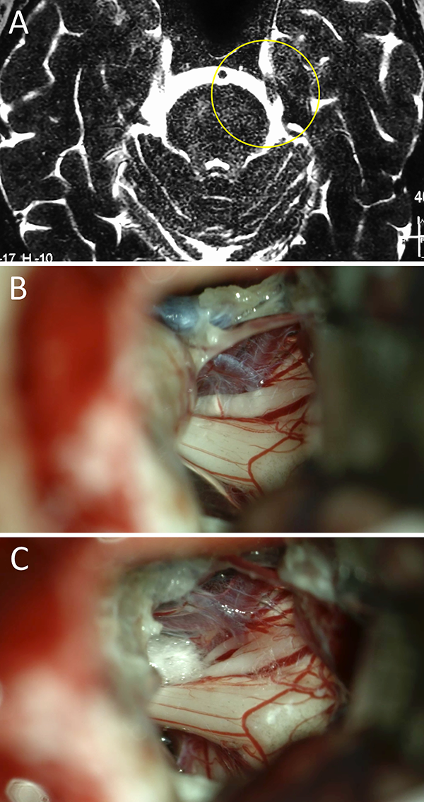 Figura 2: Varón de 45 años de edad con clínica de NT típica refractaria al tratamiento farmacológico. En RM no se evidencio CNV alguno, por esto su neurólogo de cabecera indicó tratamiento farmacológico durante más de un año. Finalmente consultó con nuestro equipo y se decidió conducta quirúrgica en virtud a la clínica. En el intraoperatorio se evidenció un claro CNV del lado izquierdo. Evolucionó favorablemente con remisión del cuadro doloroso. A) RM preoperatoria; B) hallazgo intraoperatorio, CNV ; C) colocación de teflón. NT: neuralgia trigeminal; RM: resonancia magnética; CNV: conflicto neurovascular.