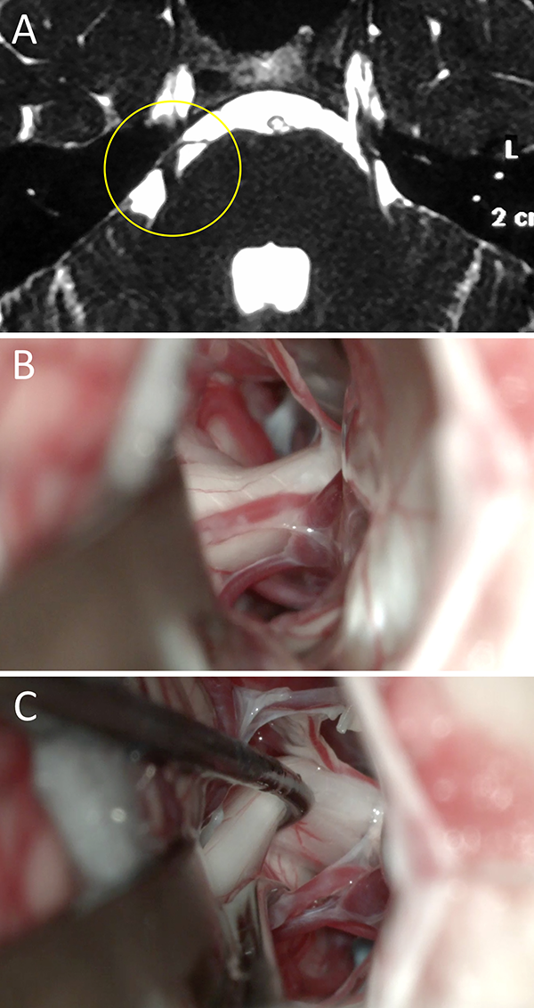Figura 4: Mujer de 45 años de edad que presenta clínica de NT atípica refractaria a múltiples terapéuticas. En RM no se objetivo CNV. Ante persistencia del cuadro y el paciente expresó la voluntad de someterse a tratamiento quirúrgico. Se decidió DNV; durante la cirugía no se evidencio CNV alguno y se realizó neuropraxia. El paciente evolucionó con mejoría clínica. A) RM preoperatoria; B) hallazgo intraoperatorio; C) neuropraxia. NT: neuralgia trigeminal; RM: resonancia magnética; CNV: conflicto neurovascular; DNV: descompresiva neurovascular.