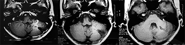 El estudio de RMN presenta una lesión bien circunscrita en hemisferio cerebeloso izquierdo con periferia de predominio hiperintenso en T1 y T2, y centro hipointenso, edema perilesional mínimo, así como una imagen de un vaso venoso alimentador que recorre hacia el ángulo pontocerebeloso izquierdo.