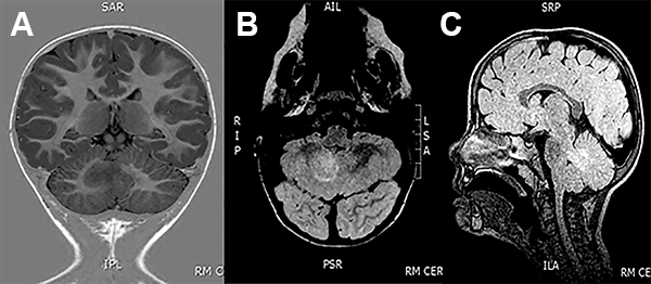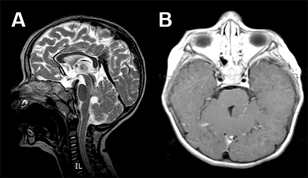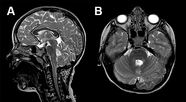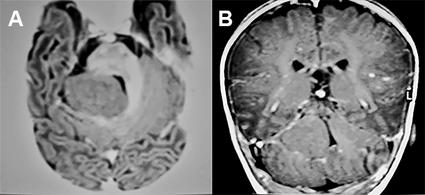 La RMN de encéfalo evidenció una lesión expansiva cerebelosa en contacto con el IV ventrículo y los pedúnculos cerebelosos superior y medio izquierdo, con leve efecto de masa que no realza con contraste (fig. 1).