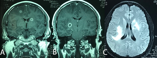Imagen 1: RMN de cerebro: (A) y (B): cortes coronales en secuencia T1 con contraste donde se observan imágenes múltiples con captación de contraste en anillo. (C): corte axial en secuencia Flair que muestra edema peri lesional.