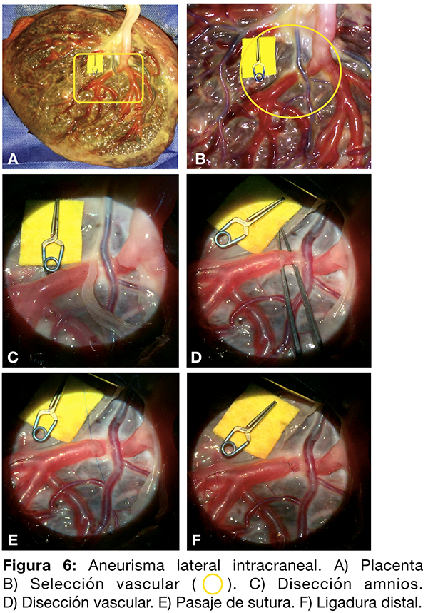 Mediante la utilización de una bomba de infusión continua se pudo simular la pulsatilidad del flujo sanguíneo para mayor representatividad del escenario quirúrgico y practicar clipado aneurismático con y sin ruptura.9,10 El posicionamiento de la placenta en cráneo y fijación con cabezal Sugita® permite la apertura amniótica mediante el microscopio quirúrgico como ejercicio de disección silviana. A su vez el trabajo en profundidad, utilizando la pinza bipolar y la aspiración continua para la inspección, disección y clipado de los aneurismas generados, reproduce en forma realista el manejo de la patología aneurismática.7,11
