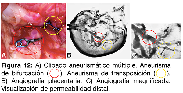 Se realiza un cateterismo placentario del vaso arterial madre del cordón umbilical mediante un catéter guía 6F fijado con una ligadura de lino n°60. Se procede a la inyección de contraste iodado diluido al 70% donde se observa la conformación vascular arterial y el aneurisma con la respectiva fuga de contraste (fig. 8 A). El cateterismo permite verificar un clipado aneurismático inadecuado, con un cuello remanente (fig. 8 B) y su corrección (fig. 8 C-D).