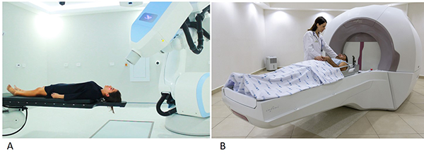 Figura 1: A) Muestra el sistema de radiocirugía robótica Cyberknife B) Bisturí de rayos gamma rotatorio Infini.