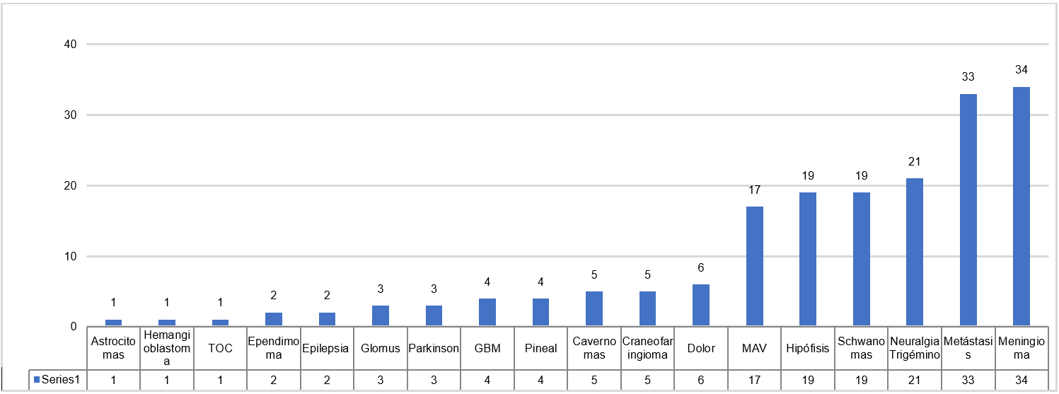 En enero del 2019 el sistema de radiocirugía Cyberknife entró en funcionamiento y comisionamiento. Con fines comparativos, cinco planes que fueron ejecutados con Infini para tratar diversas patologías que incluían una malformación arteriovenosa, un tumor de hipófisis, un schwanoma, un craneofaringeoma, y la esfera con el colimador de 4 mm para Infini y de 5 mm para Cyberknife en dichos planes se utilizó las mismas estructuras y GTV al igual que la misma dosis de prescripción, se calculó el gradiente de dosis en todos los planes para entender comparativamente el Índice de Gradiente de Dosis en comparación a Infini, cobertura y conformalidad. De igual manera, en febrero del 2019 Cyberknife inició su uso clínico y entre esa fecha y enero del 2020, entre las dos instituciones en Centroamérica se trataron 210 pacientes con radiocirugía utilizando el Infini™ (Masep Medical Company, Shenzhen, China) y el sistema de radiocirugía robótica Cyberknife™ (Accuray, Sunnyvale, California, USA). De estos pacientes, 180 pacientes fueron tratados de diversas patologías intracraneales, 120 con Infini y 60 con Cyberknife (Tabla 1, graf. 1).