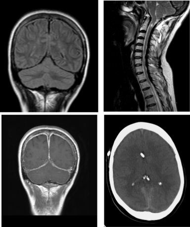 Figura 1. RM cráneo y columna cervical. Arriba a la izquierda, imagen en T2 donde se ve el tentorio y la hoz hipointenso y engrosado. A la derecha, RM de columna cervical sagital que muestra el engrosamiento del ligamento amarillo a nivel cérvicodorsal y los restos de siringomielia cervical tras la descompresión de fosa posterior. Abajo, izquierda, cortes coronales en T1 con gadolinio, observándose la captación de la duramadre de la convexidad, del tentorio y de la hoz, con una zona hipointensa en el interior, sobre todo en la hoz cerebral. A la derecha, TC de cráneo con catéter proximal normoposicionado y ventrículos en hendidura.