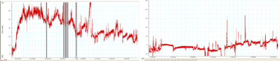 Figura 2. A la izquierda, monitorización de la PIC al inicio del cuadro. Se puede ver una presión intracraneal muy elevada, manteniéndose durante varias horas entre 20 y 50 mmHg. A la derecha, la monitorización de la PIC tras 24 horas del inicio de la toma de corticoides, con desaparición de las ondas de elevación patológica y PIC normal-baja.