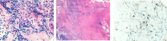 Figura 3. Biopsia meningea. A la izquierda, HE a 40x que muestra infiltrado inflamatorio con linfocitos, histiocitos, células plasmáticas y algún eosinófilo. En el centro, HE a 4x que muestra el estroma fibroso, sin signos de flebitis obliterante. A la derecha, inmunohistoquímica IgG4 a 40x, con menos de 10 células IgG4 por campo de gran aumento (9 en la imagen).