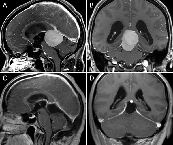 Meningioma tentorial medial. A-B: RM preoperatoria; C-D: RM postoperatoria.