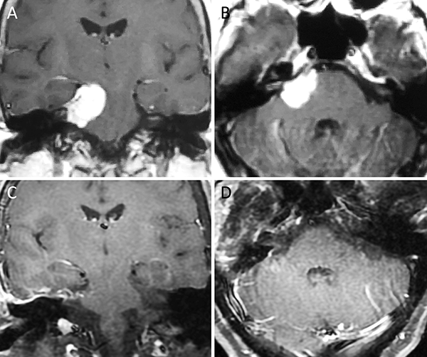 Meningioma petroso anterior. A-B: RM preoperatoria; C-D: RM postoperatoria.