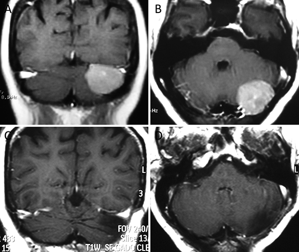 Meningioma petroso posterior. A-B: RM preoperatoria; C-D: RM postoperatoria.