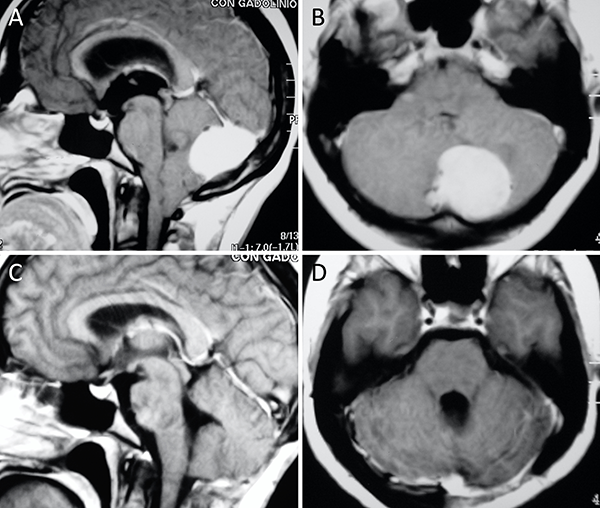 Meningioma del foramen magno posterior. A-B: RM preoperatoria; C-D: RM postoperatoria.