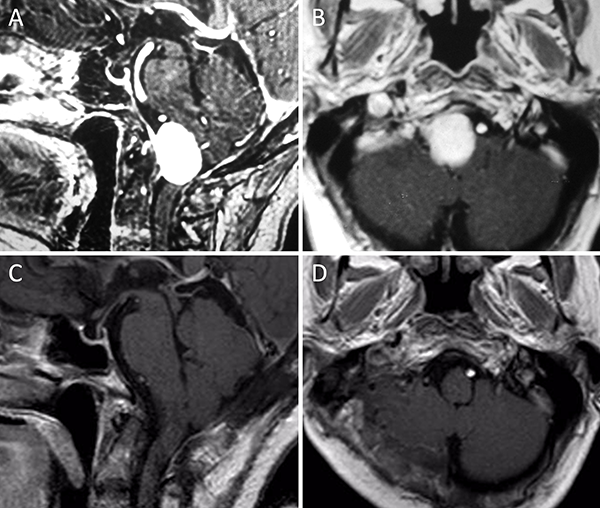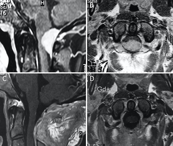 Meningioma clival. A-B: RM preoperatoria; C-D: RM postoperatoria.