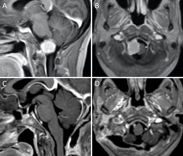 Meningioma del foramen magno anterior. A-B: RM preoperatoria; C-D: RM postoperatoria.