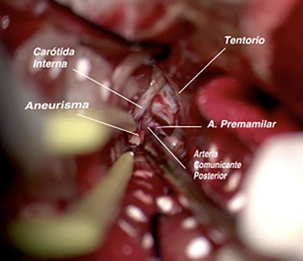 Figura 1. Imagen de la anatomía quirúrgica previo al clipaje del aneurisma donde se identifica la arteria carótida interna con el nacimiento de la arteria comunicante posterior y la arteria premamilar, así como el aneurisma del segmento comunicante.