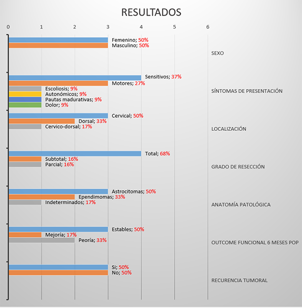 Resultados: Se operaron seis pacientes cuya edad promedio fue 9,9 años (rango 9 meses-17 años). La manifestación clínica predominante fue déficit sensitivo (37%), seguida de déficit motor (27%). El tiempo promedio desde la aparición de los síntomas al diagnóstico fue 9,4 meses, excepto un caso atípico de hiperhidrosis con ocho años de evolución. Se logró exéresis completa en 68%, subtotal en 16% y parcial en 16%. El status funcional seis meses postoperatorio se mantuvo estable en 50%, y mejoró en 17%.