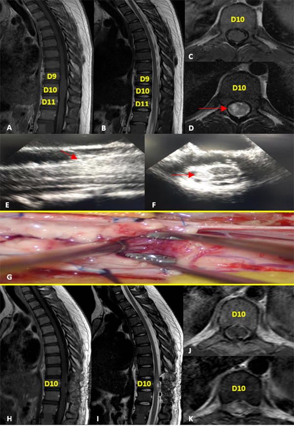 Figura 2: Indeterminado. A-D: RM prequirúrgica T1 con contraste y T2 cortes axiales y sagitales. E-F: Ecografía intraoperatoria. G: Imagen intraoperatoria. H-K: RM postquirúrgica T1 con contraste y T2 cortes axiales y sagitales.