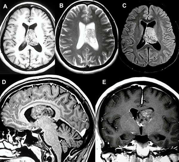 Paciente de sexo femenino de 35 años de edad quien debido a accidente automovilístico efectuó estudio tomográfico de encéfalo donde se observó lesión intraventricular redondeada, de gran tamaño, heterogénea, predominantemente isodensa con focos hipodensos en su interior. Fue derivada a servicio de Neurocirugía, se realizó estudio de resonancia magnética del encéfalo con y sin contraste.