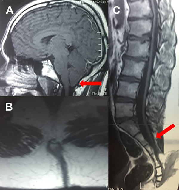 Figura 2. a) RM de cerebro que muestra descenso de amígdalas cerebelosas. b,c) RM de columna lumbosacra secuencia T1, cortes axial y sagital que evidencian un trayecto fistuloso descendente a nivel sacro que llega hasta el coxis. Además se observa el cono medular descendido y anclado a nivel sacro (flecha roja).
