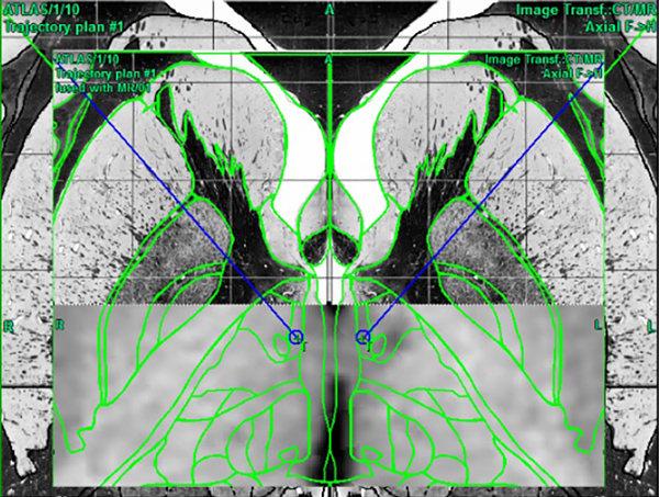 Figura 1. Planeamiento quirúrgico mediante software Praezis AG 3A plus para identificar hipotálamo posteromedial usando el atlas de estereotaxia de Schaltenbrand y Wahren.10