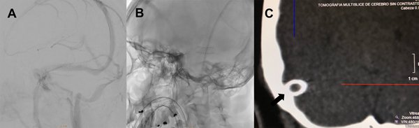 Figura 4: A) Angiografía cerebral digital con adquisición oblicua anterior izquierda en tiempo venoso luego de la impactación del stent en donde se observa el seno transverso derecho sin estenosis residual. B) Radiografía de cráneo en incidencia oblicua anterior izquierda donde se observa el stent abierto implantado en el seno transverso derecho. C) TC de cerebro. Reconstrucción coronal del detalle témporo-occipital derecho. La flecha negra muestra el stent abierto implantado en el seno transverso derecho.