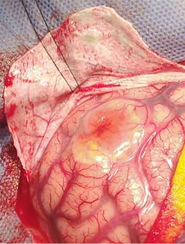 Durante el procedimiento, se coloca al paciente en decúbito dorsal con la cabeza lateralizada hacia la derecha. Se realiza abordaje parietal izquierdo y, luego de extraer la plaqueta ósea, se evidencia la duramadre también intacta. Se decide por una ecografía intraoperatoria para localizar la lesión. En la misma se observa una imagen hiperecoica sin bordes definidos en el centro del campo. Luego de la apertura dural, se localiza la lesión intraaxial con expresión cortical, de bordes no definidos, infiltrante, sin plano de clivaje (Fig. 2). Esto no era compatible con lo que esperábamos encontrar acorde a los estudios prequirúrgicos. Se lleva a cabo la resección en bloque con márgenes libres y control por anatomía patológica.