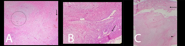 Figura 3: Fotos histopatológicas en donde se observan a) fibroblastos elongados de forma desorganizada, en una matriz mixoide, bien delimitado, pero no encapsulado (circulo negro), acompañadas con zonas de hemorragia e infiltraciones de células linfoides (flecha negra), b) afectación ósea y expansión de áreas de tejido fibroblástico comunicadas entre sí (flecha negra) y c) fibroblastos elongados de forma desorganizada, en una matriz mixoide (flecha corta) y afectación ósea (flecha larga).