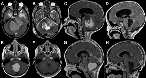 E, F, G y H: Imágenes axiales y sagitales de RM ponderadas en T1 con gadolinio, de un paciente con lesión en fosa posterior compatible con Astrocitoma de fosa posterior y su resección completa (GTR).