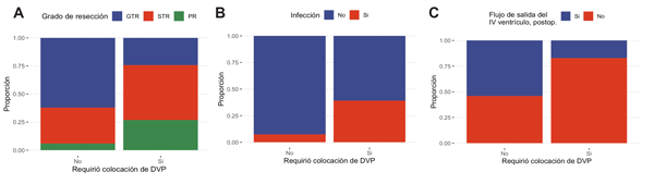 Figura 3: A: Grados de resección: proporciones según requerimiento o no de sistema derivativo. B: Infección: proporciones según requerimiento o no de sistema derivativo. C: Flujo de salida por el IV ventrículo en imagen postoperatoria: proporciones según requerimiento o no de sistema derivativo.