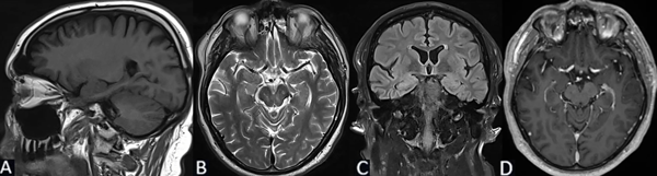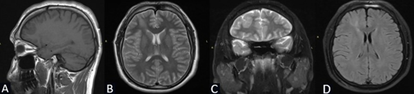 Figura 2. Caso 2: RM de cerebro. A) Secuencia T1. Corte sagital. B) Secuencia T2. Corte axial. C) Secuencia T2 “TIRM Dark Fluid”. Corte coronal. D) Secuencia T1 con contraste. Corte axial.