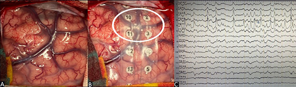 Figura 3. Caso 1. A) Región dorso lateral frontal derecha precoronal. B) Grilla de 16 contactos. C) EcoG prerresección: patrón de ondas de alto voltaje, continuas, con una frecuencia mayor a 4 Hz sobre los canales que corresponden a los contactos 2-3-10-11.