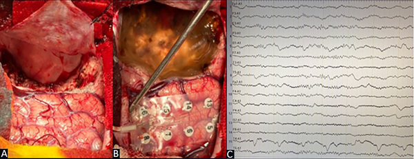 Figura 4. Caso 1. A) Lecho quirúrgico. B) Control postresección de zona perilesional. C) EcoG postresección: resolución completa de la actividad epileptiforme.