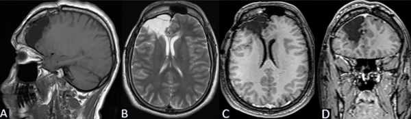 Figura 6. Caso 1: RM de cerebro postquirúrgica. A) Secuencia T1, corte sagital. B) Secuencia T2, corte axial. C) Secuencia T1 con contraste, corte axial. D) Secuencia T1 con contraste, corte coronal.